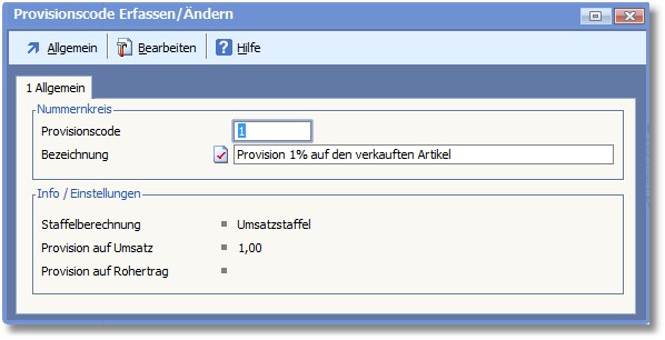 Über Provisionscodes werden Provisionssätze verwaltet. Provisionscodes werden Artikeln oder Adressen zugeordnet.
