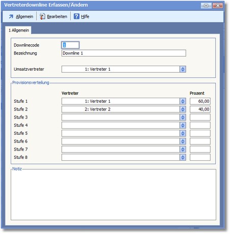 Über die Vertreterdownline können Sie die Provision eines Vertreters ganz oder teilweise auf mehrere andere Vertreter verteilen.