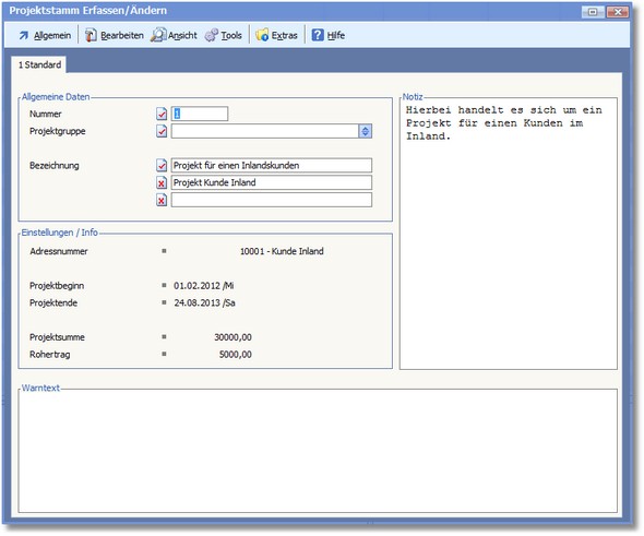 << Hier KLicken um eine Inhaltsübersicht anzuzeigen >> Navigation: Warenwirtschaft > Stammdaten > Projekte > Projekte anlegen und ändern > Die Karteikarte "Standard" |