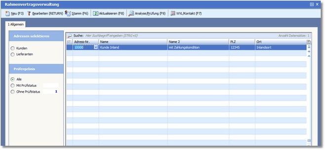 Das Programm öffnet die vorgelagerte Auswahltabelle der Rahmenvertragsverwaltung, in der alle Adressen (Vertragspartner) mit aktiver Kontraktverwaltung ersichtlich sind.
