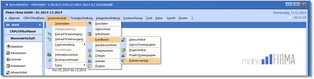 1. Klicken Sie mit der Maus im Hauptmenü auf "Warenwirtschaft > Stammdaten > Konditionen > Rahmenverträge".