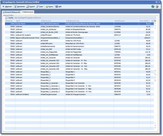 Der Selektionspool der Adress/Artikel enthält die von Ihnen in den Pool überstellten Adress/Artikelkonditionen und ist komplett designbar. Es sind pro Bereich und Bediener 999999 verschiedene Pools mit unterschiedlichem Design und Daten möglich. Jeder Selektionspool ist ein Schnappschuss der Datensätze zu dem Zeitpunkt, zu dem sie in den Pool eingefügt werden.