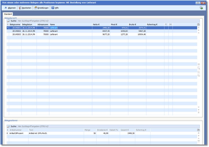 Hier wird beschrieben, wie Sie alle Positionen aus einem oder mehreren Belegen in den aktuellen Beleg kopieren können.