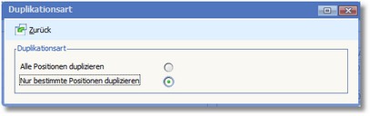 3. Überprüfen Sie die hier angezeigten Einstellungen und nehmen Sie bei Bedarf noch Änderungen (z.B. an Belegart oder Adressnummer) vor. 4. Klicken Sie auf den Menüeintrag "Bearbeiten > Duplikationsart". 5. Aktivieren Sie hier den Radiobutton "Nur bestimmte Positionen duplizieren" und klicken Sie auf <Zurück>. 6. Starten Sie die Duplikation anschließend mit [F9].