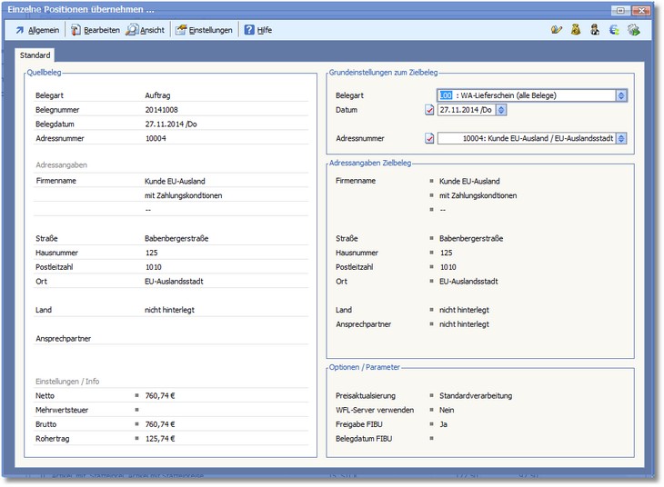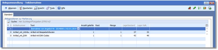 Die Tabelle "Belegumwandlung - Teilübernahme" wird nun geöffnet.