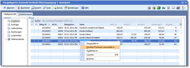 Hier wird beschrieben, wie Sie in der Belegtabelle Wareneingang/Warenausgang eine oder mehrere Positionen eines Belegs in die nächsthöhere Belegart (z.B. Auftrag -> Lieferschein) wandeln können.