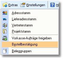 1. Wählen Sie die Bestellung, deren Bestätigungsdaten Sie bearbeiten möchten, in der vorgelagerten Belegauswahl "WE-Bestellung" aus und klicken Sie mit der Maus auf den Symbolbutton <Extras> und dann "Bestellbestätigung".