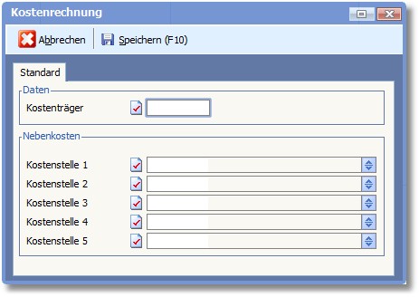Kosten können auf bis zu fünf Kostenstellen verteilt werden. Eingetragen wird jeweils die Nummer der Kostenstelle. Die [F5]-Taste oder ein Mausklick auf die Pfeiltaste öffnet die Kostenstellenauswahl. Hier können Sie eine Kostenstelle auswählen und die Nummer in das Feld übernehmen.