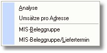 In der Tabelle "Warengruppenauswahl" können Sie eine Warengruppe suchen und über den Button <Auswertung> oder mit der Taste [RETURN] öffnet sich ein Popup-Menü mit folgenden Analysemöglichkeiten: