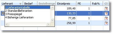1. Wählen Sie eine Bestellzeile aus. 2. Navigieren Sie den Cursor mit der [TAB]- oder [RETURN]-Taste in die Spalte LIEFERANT. 3. Drücken Sie in der Spalte LIEFERANT die Funktionstaste [F5], um eine Liste mit den möglichen Auswahltabellen aufzurufen.