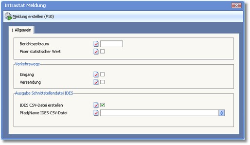 Aktivieren Sie den Status þ dieses Feldes, wenn das Programm die Schnittstellendatei für IDES (Software des Statistischen Bundesamtes zur Übertragung der Meldungen) erstellen soll.