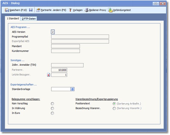 In der Karteikarte "Standard" des AES-Dialogs werden grundlegende Einstellungen zum AES-Programm hinterlegt und in der Karteikarte "FTP-Daten" geben Sie anschließend die AES-Verbindungsdaten zum FTP an.