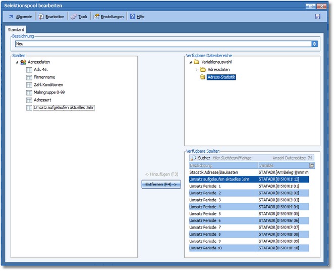 Wie nun zum bestehenden Selektionspool neue Spalten, wie z.B. Adressgruppe und Umsatz, hinzugefügt werden kann, ist bereits bekannt.