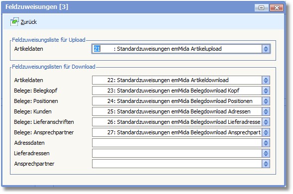 In den Feldzuweisungslisten ist definiert, welches Feld im Programm in welches Feld im Shop übertragen wird. Für jeden Bereich (Artikelupload, Artikeldownload) gibt es eine Feldzuweisungsliste.