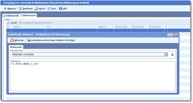 << Hier KLicken um eine Inhaltsübersicht anzuzeigen >> Navigation: Warenwirtschaft > Selektionspools > Neuerungen Selektionspool > Profierfassung > Platzhalter > Platzhalter mit Refresh |