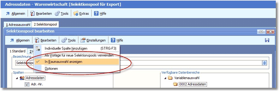 Wenn man in der Adressauswahl im Baum auf einem bestimmten Selektionspool-Ast steht und in die Kartei "Selektionspool" wechselt, steht man automatisch in jenem Pool und kann ggf. sofort diverse Prozesse anstoßen.