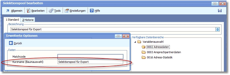 In den Eigenschaften eines Selektionspools unter "Bearbeiten > Optionen" kann zusätzlich ein Kurzname für die Bezeichnung des Selektionspools in der Baumauswahl angegeben werden.