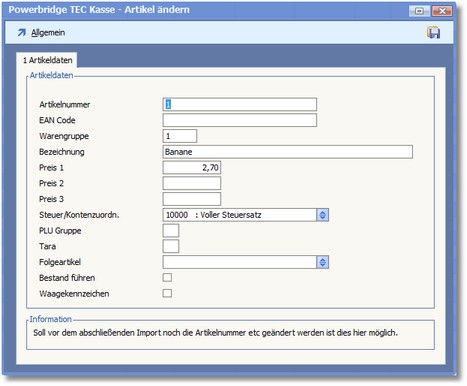 << Hier KLicken um eine Inhaltsübersicht anzuzeigen >> Navigation: BüroWARE Powerbridge > TEC-Kassenschnittstelle > BüroWARE-Schnittstelle einrichten > Artikel importieren > Importartikel bearbeiten |