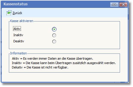 Der Kassenstatus dient als Voreinstellung für das Senden der Daten an die Kasse und das Auslesen der Berichte aus der Kasse.