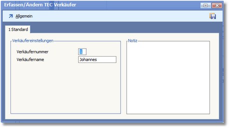 << Hier KLicken um eine Inhaltsübersicht anzuzeigen >> Navigation: BüroWARE Powerbridge > TEC-Kassenschnittstelle > Verwaltung TEC Kasse > Verkäufer erfassen/ändern |