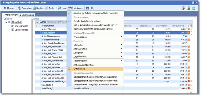 1. Öffnen Sie die vorgelagerte Auswahl Artikelstamm Menü "Einstellungen > EAN-Formate".