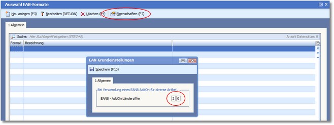 In den EAN-Gundeinstellungen muss die EAN8-ADDON LÄNDERZIFFER eingetragen werden, z.B. Beispiel "2 0", die "2" ist vorgegeben, die zweite Ziffer kann frei eingegeben werden, voreingestellt ist hier die "0". Speichern Sie die Eingaben mit [F10].