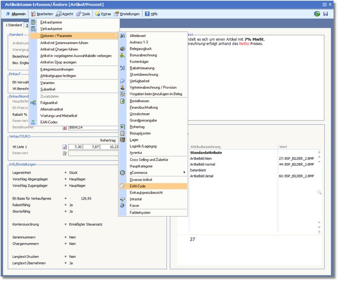 4. Speichern Sie Ihren Eingaben und rufen Sie nun im Artikelstamm den Menüeintrag "Bearbeiten > Optionen/Parameter > EAN-Code" auf.