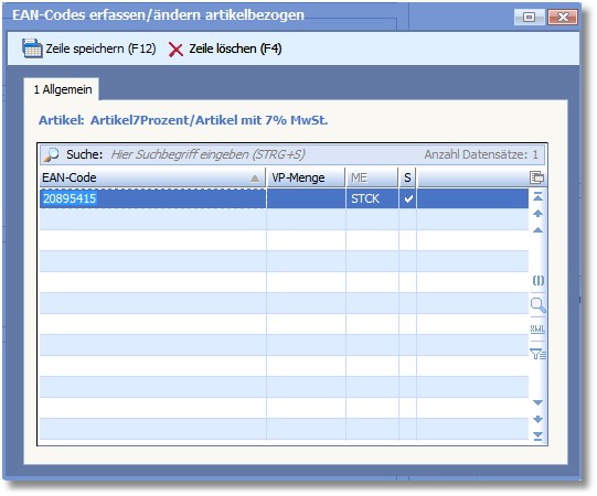 Dieser wird nun auch in der Auswahltabelle der EAN-Codes für den Artikel angezeigt (Artikelstamm Menü "Bearbeiten > EAN-Codes").