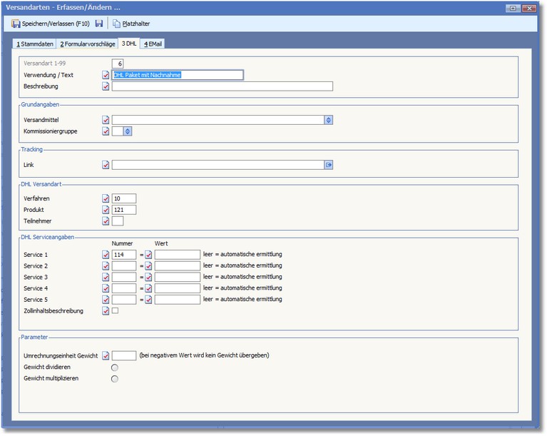 Navigation: Warenwirtschaft > Lagerverwaltung > Lager-/Logistikcenter > Logistiker "DHL" (EasyLog) >