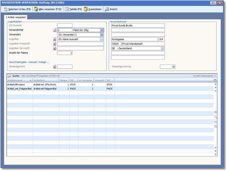 Artikel in einem Paket verpacken: Mit [F10] oder einem Klick auf diesen Button wird die Menge in der SPALTE ZU VERPACKEN komplett in einem Paket verpackt.
